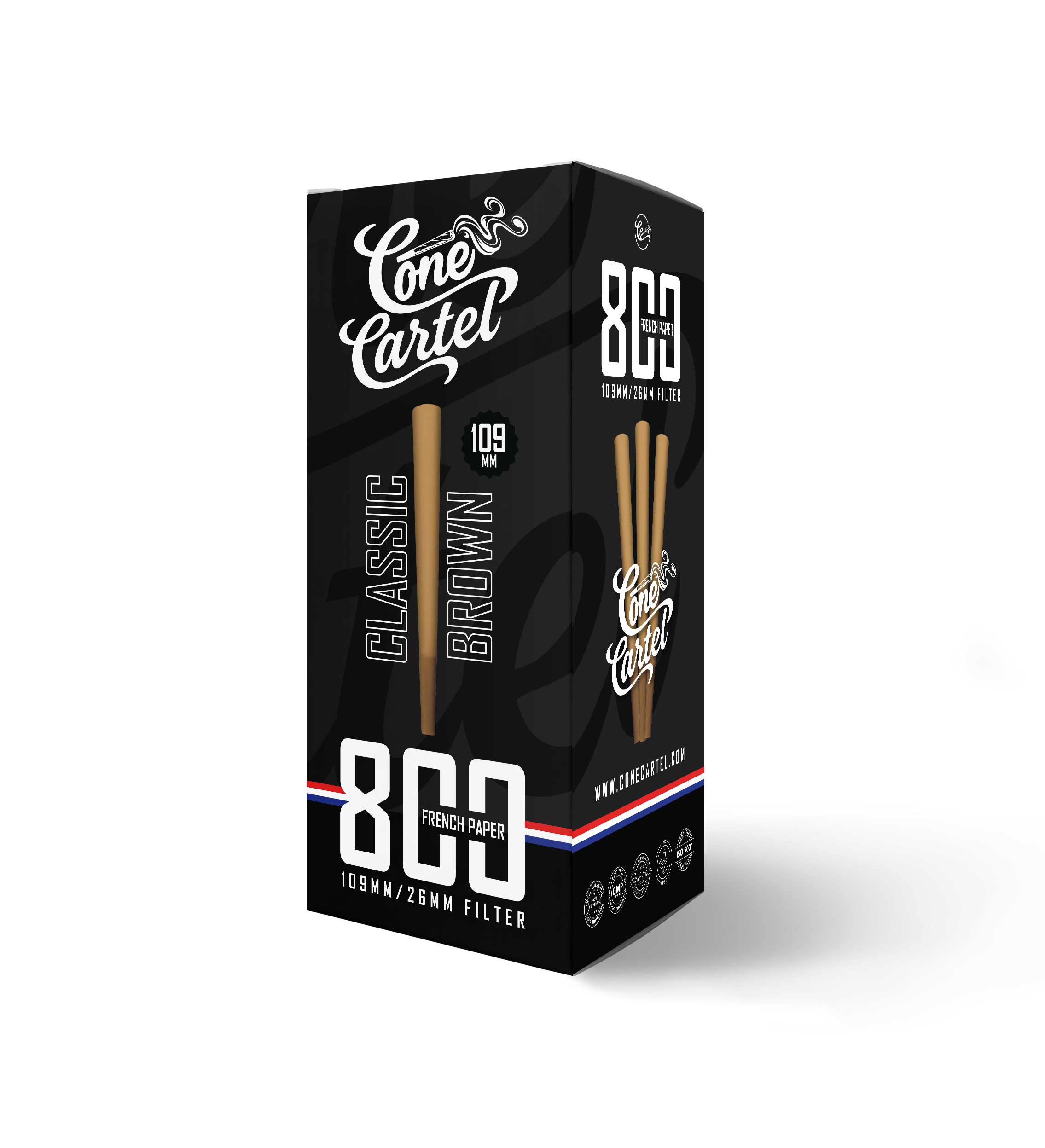 Natural-style 109mm French paper cones with a 26mm filter for an even, smooth burn—ready to fill and enjoy.